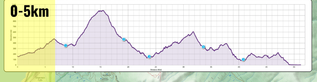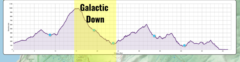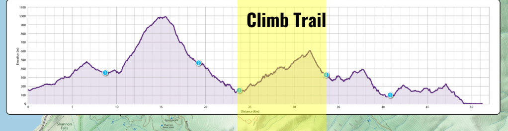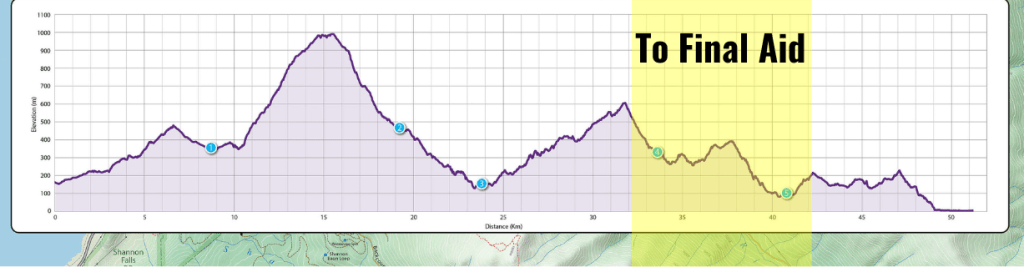 I’m not really sure when as I just focused on pushing the climb trail section but, my legs felt like concrete blocks again. I had been taking in 100g of carbs per hour so I knew it wasn’t a fueling issue. I started taking in a few salt tabs… “maybe it’s an electrolyte issue,” I thought. This trail consistented of endless switch backs with decent stretches between each corner so I power hiked the corners and ran the in between. There were two guys that I leap frogged with here, gaining some confidence here as eventually gapped them and put some good time in on them. My legs might have been heavy but, I sure as hell was going to make them move. This climb topped out around 29km gaining 451m of elevation over the 7km section.