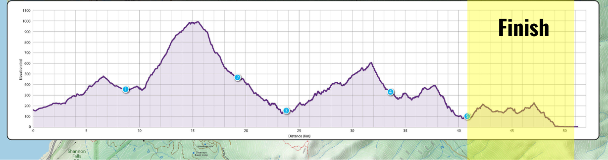I’m not really sure when as I just focused on pushing the climb trail section but, my legs felt like concrete blocks again. I had been taking in 100g of carbs per hour so I knew it wasn’t a fueling issue. I started taking in a few salt tabs… “maybe it’s an electrolyte issue,” I thought. This trail consistented of endless switch backs with decent stretches between each corner so I power hiked the corners and ran the in between. There were two guys that I leap frogged with here, gaining some confidence here as eventually gapped them and put some good time in on them. My legs might have been heavy but, I sure as hell was going to make them move. This climb topped out around 29km gaining 451m of elevation over the 7km section.